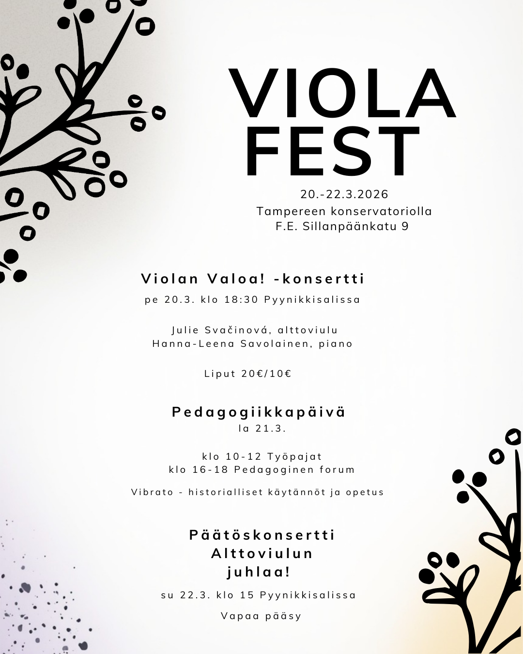 Violafest -tapahtuma pidetään tänä vuonna 20.-22.3.2026 Tampereen konservatoriolla, F.E.Sillanpäänkatu 9.